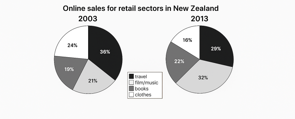 → Menjelaskan kontribusi besar dari sektor pakaian. - “The proportion of book sales slightly decreased, from about one-fifth in 2003 to a little over one-fifth in 2013.”
